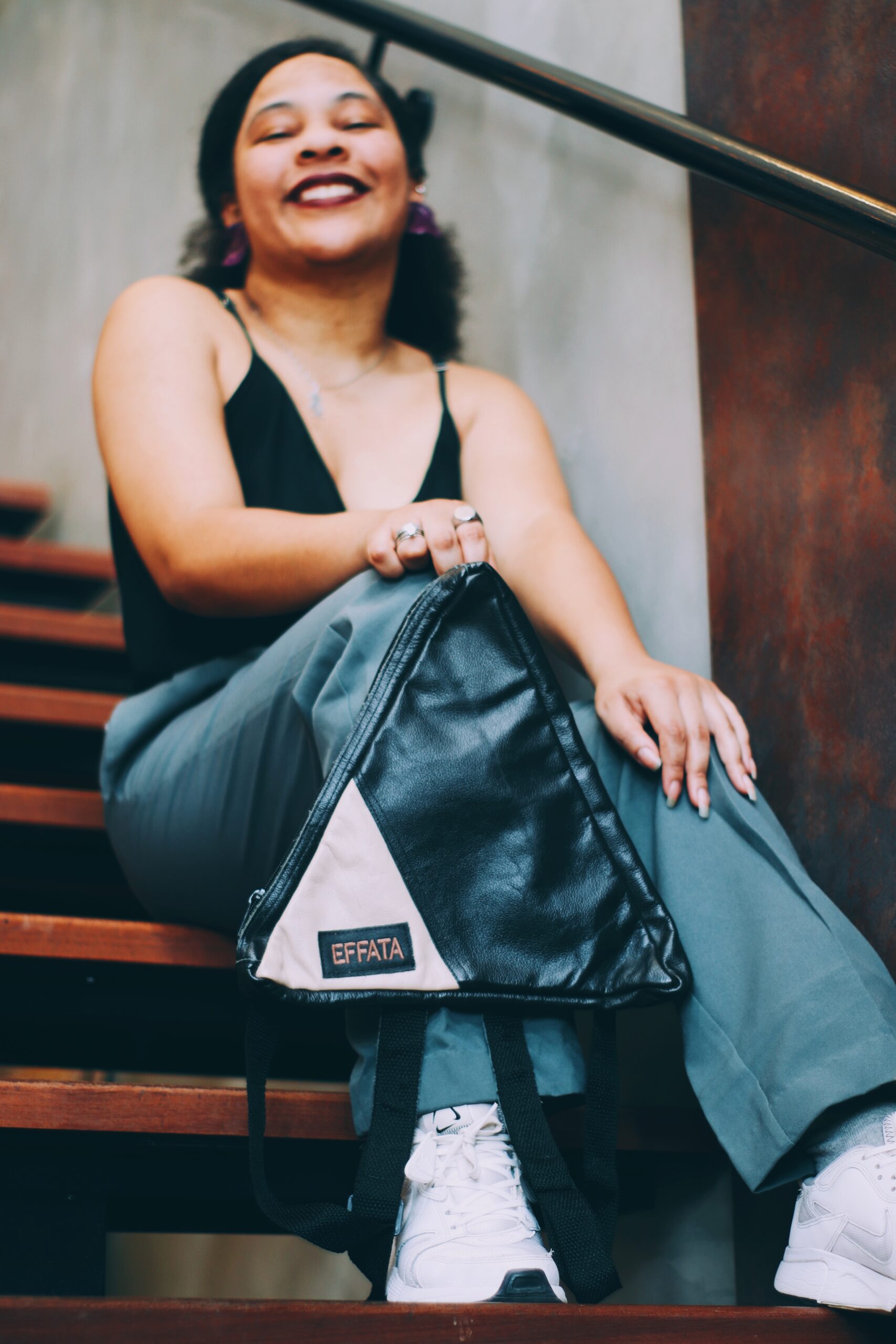 Em formato triangular, a mochila Amor tem alças em couro e nylon. Cabe itens maiores como um caderno a5, estojo de maquiagem (ou de higiene pessoal), celular, chaves e uma blusa caso faça frio.