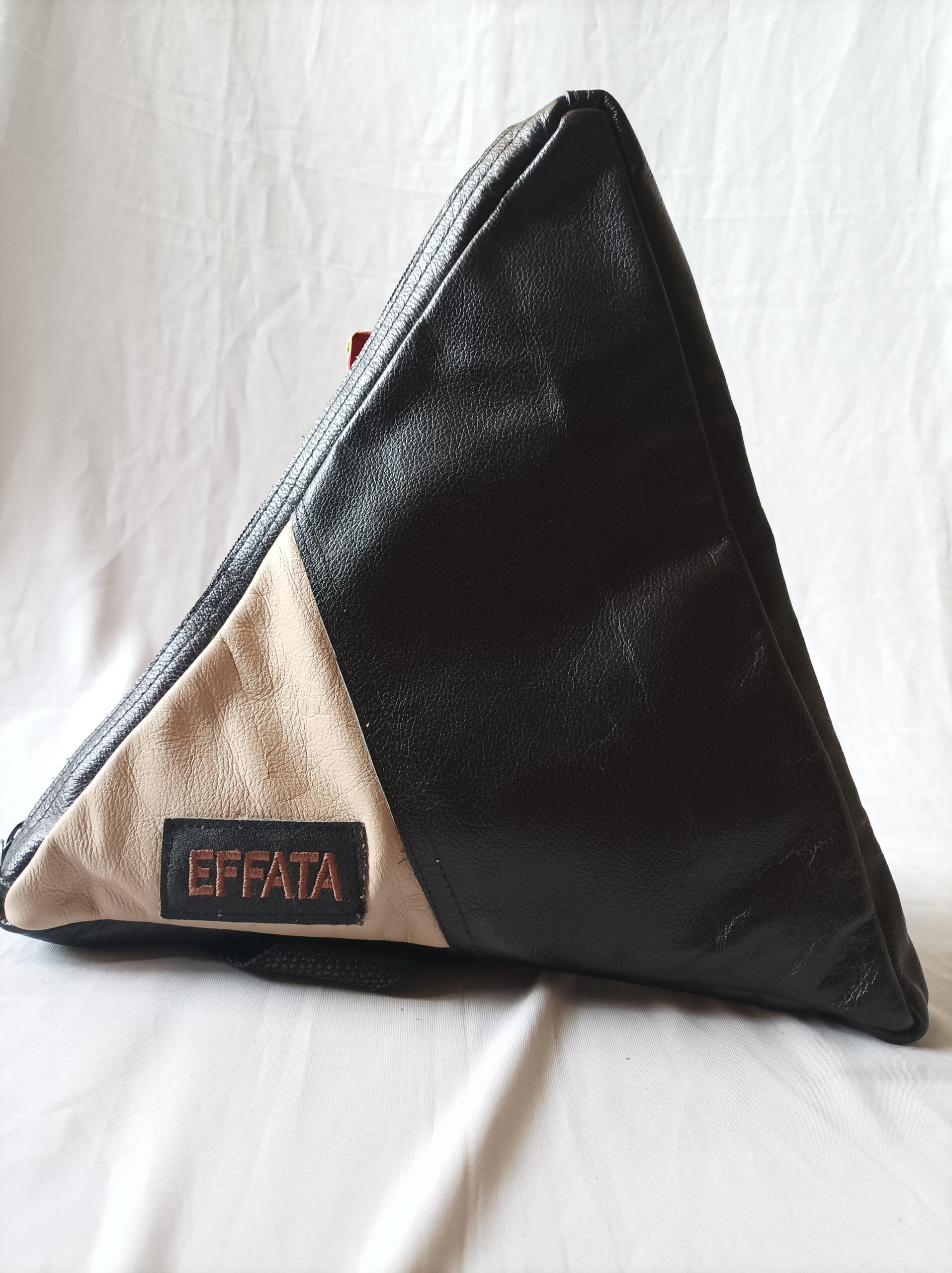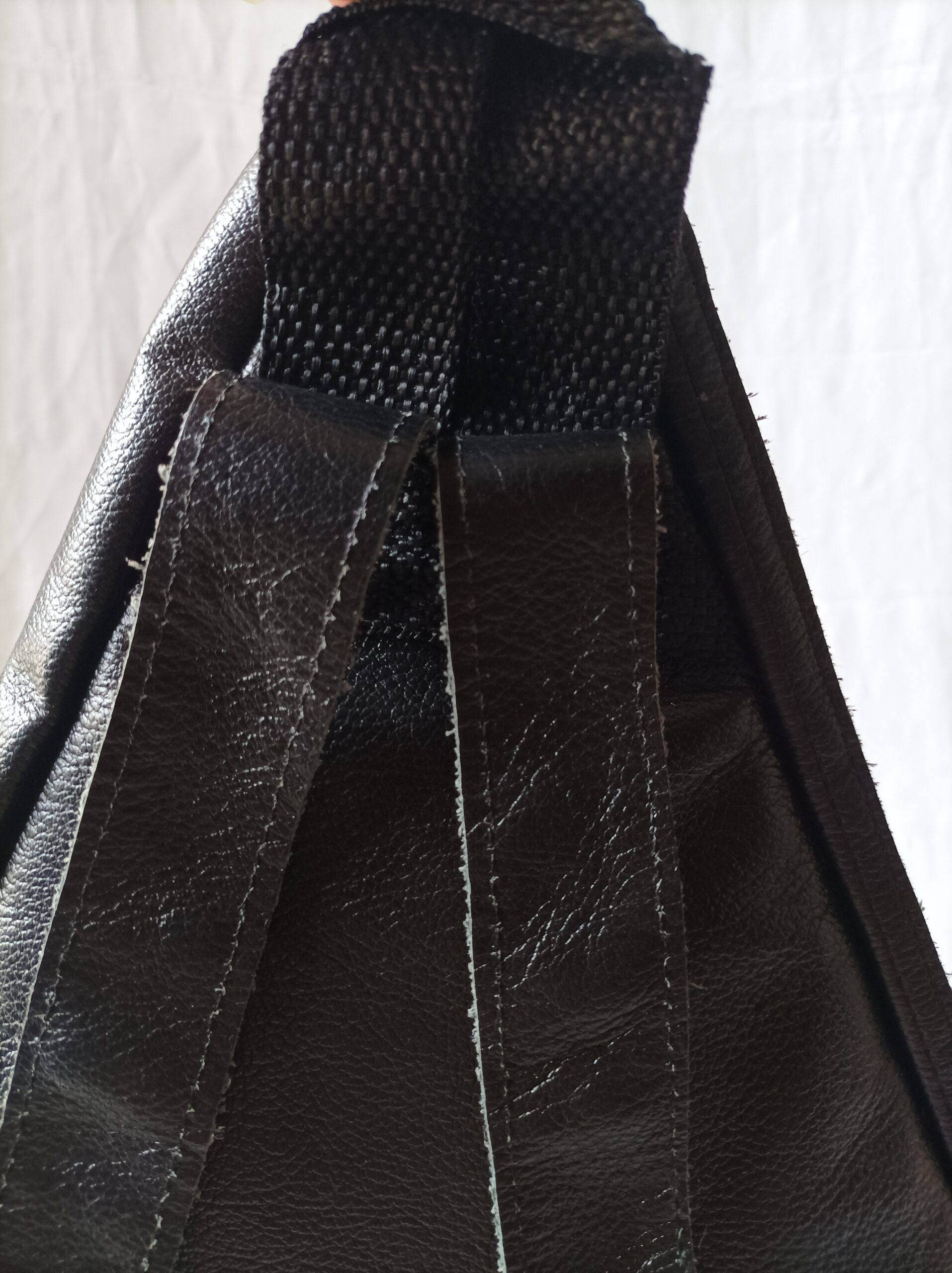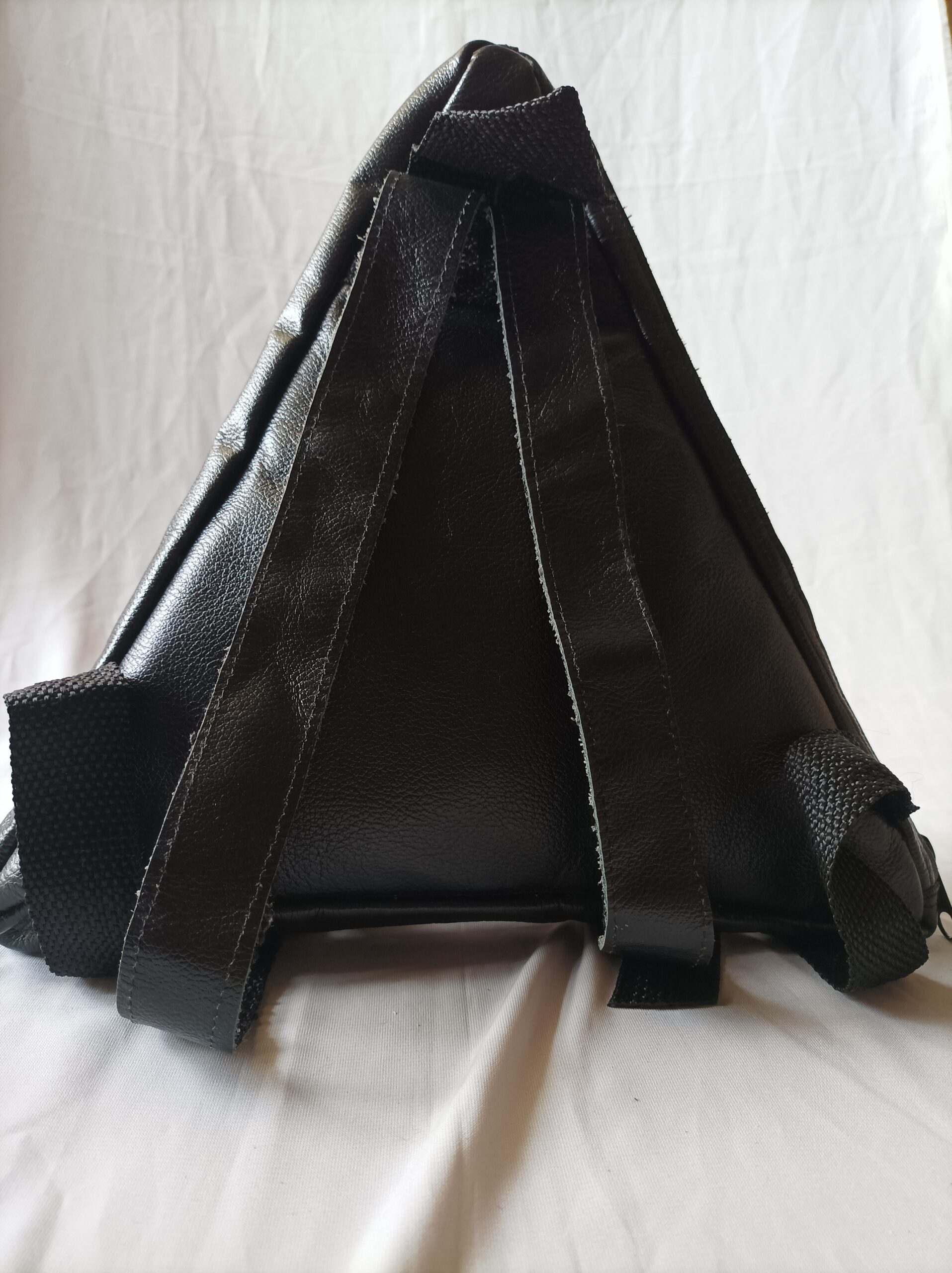 The triangular-shaped Amor backpack has a leather and nylon strap. It fits larger items such as an a5 notebook, make up case (or toiletries), cell phone, keys and a sweater in case it gets cold.